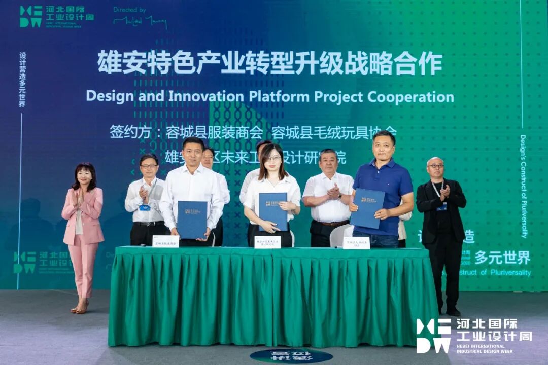 Eight projects were signed at the signing ceremony. The Design Art Institute of China Academy of Art and Xiongan Future Industrial Design Research Institute signed the Xiongan Industrial Design Innovation Cooperation Project, Rongcheng County Clothing Chamber of Commerce, Rongcheng County Plush Toy Association, The Xiongan Future Industrial Design Research Institute signed a strategic cooperation project for the transformation and upgrading of Xiongan's characteristic industries. The Ladislav Sutnar College of Art and Design and the Cangzhou Industrial Design Innovation Center signed a design education linkage innovation strategy. For cooperation projects, Tianjin Venture Incubation Association and Dingzhou Industrial Design Innovation Center signed the Beijing-Tianjin-Hebei Design Platform Innovation Strategic Cooperation Project, Hebei Kexinbo Construction Machinery Manufacturing Co., Ltd. and Hebei Shangchuang Innovation Industrial Product Design Co., Ltd. signed construction machinery equipment for appearance design cooperation projects, Shijiazhuang Hanzhuo Energy Technology Co., Ltd. and Shijiazhuang Baihu Design Co., Ltd. signed a cloud cabin overall design cooperation project. Hengshui Railway Construction Engineering Rubber Co., Ltd. and Hebei Liyi Industrial Design Co., Ltd. signed a brand design cooperation project. Zhou Chenwen Zengding Porcelain Products Co., Ltd. and Hebei Riyi Technology Co., Ltd. signed a brand design cooperation project.